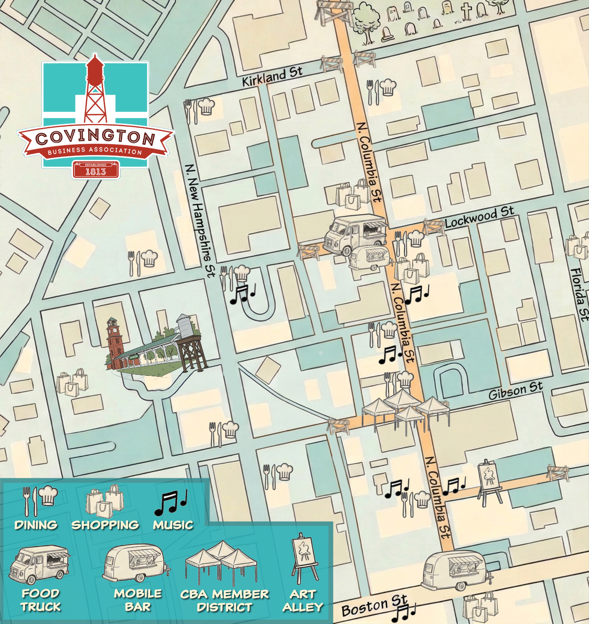 The Covington Business Association is excited to host the Columbia Street Block Parties on the last Friday of the month, March through October from 6 to 9pm. The block party is a free event open to the community, featuring Classic Cars, Car Clubs, and CBA member businesses.